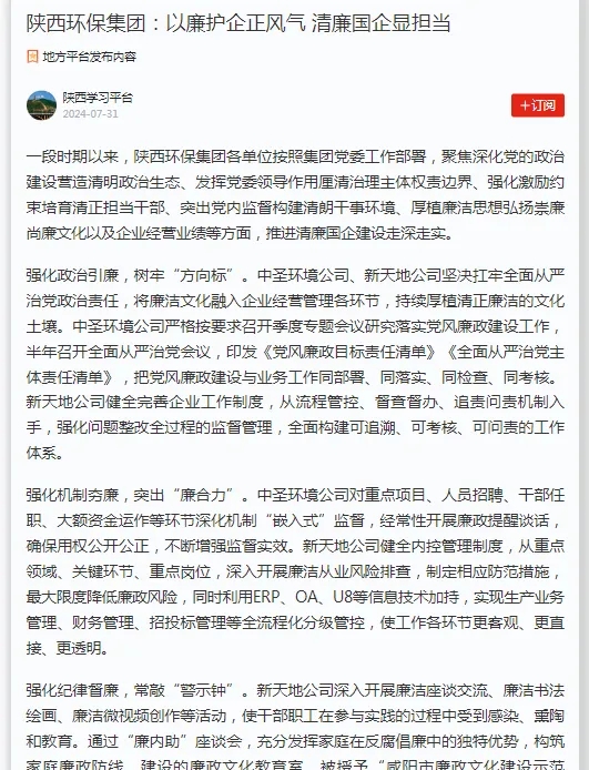 近日,學(xué)習(xí)強(qiáng)國、省國資委官網(wǎng)等平臺(tái)對(duì)陜西環(huán)保集團(tuán)清廉國企建設(shè)等情況進(jìn)行了報(bào)道?,F(xiàn)刊載如下,以饗讀者。
